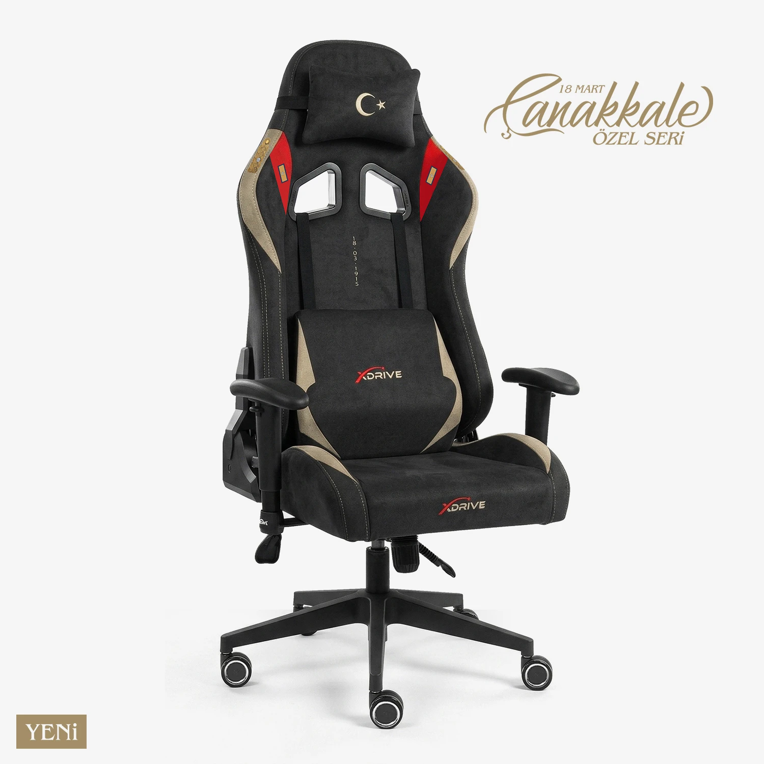 Çanakkale 18 Mart Özel Seri oyuncu koltuğu, tarihin en anlamlı destanlarından birini temsil eden özel nakış ve tasarım detaylarıyla hazırlandı. Koltuk üzerinde yer alan özgün işlemeler Çanakkale ruhunu yansıtırken, sınırlı sayıda üretilen bu seri koltuğa özel bir karakter kazandırır. Aerotex® kumaş, nefes alabilen yapısı ve yumuşak dokusuyla uzun süreli kullanımda konfor sunar. Dayanıklı ve kolay temizlenebilir yüzeyi sayesinde hem rahat hem de uzun ömürlü bir kullanım sağlar.