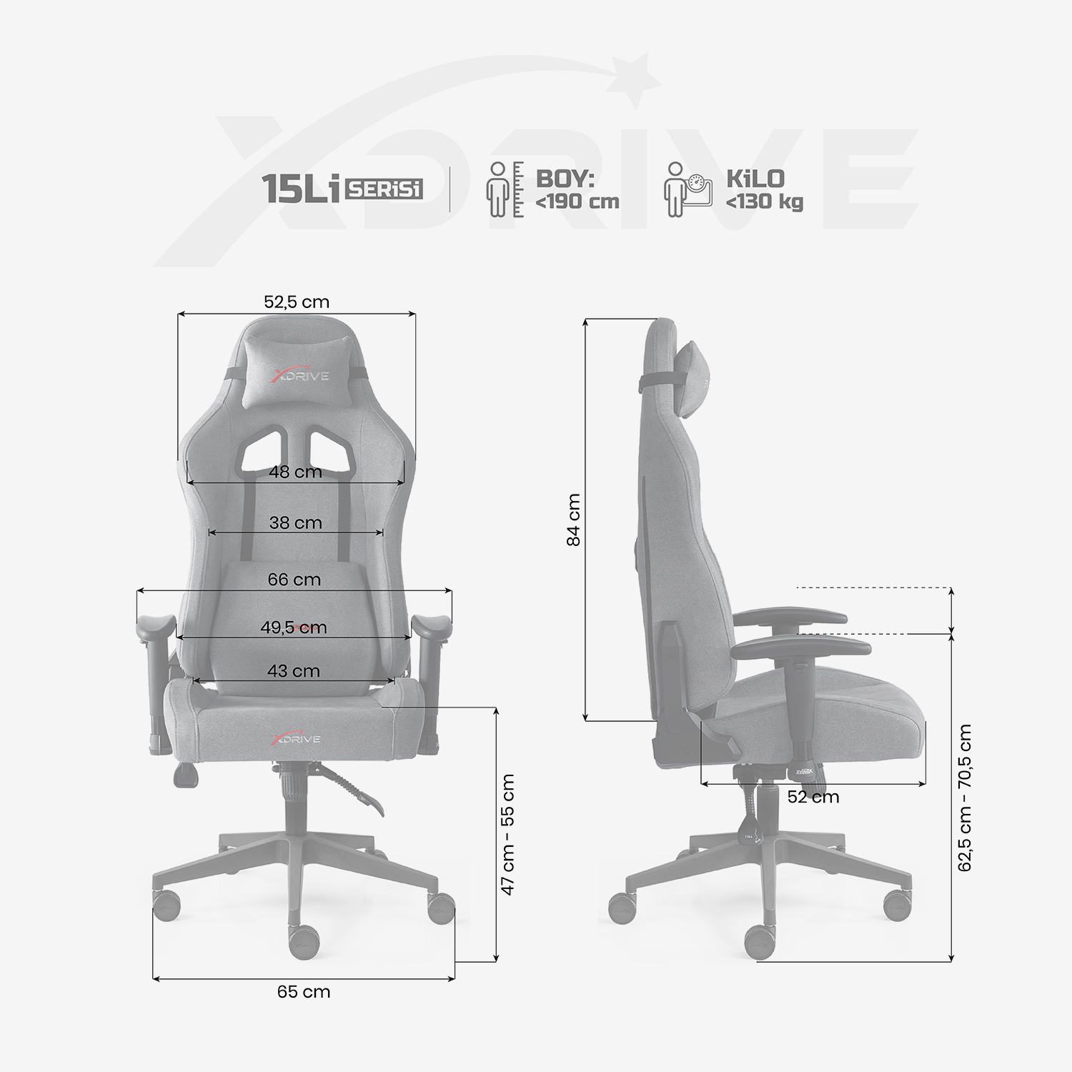 At xDrive, we offer ergonomic designs tailored to different body types—ensuring ideal seating comfort for everyone. To find the model that suits you best, simply check the Height & Weight Guide on the product page and easily identify the chair that fits your body type. Choosing the right dimensions and high-quality materials is key to achieving maximum comfort and support.To view detailed dimensions and materials used in our gaming chair models, simply click the section below. Ürün Ölçüsü Click the section below to explore detailed measurements and material specifications of our gaming chair models.
