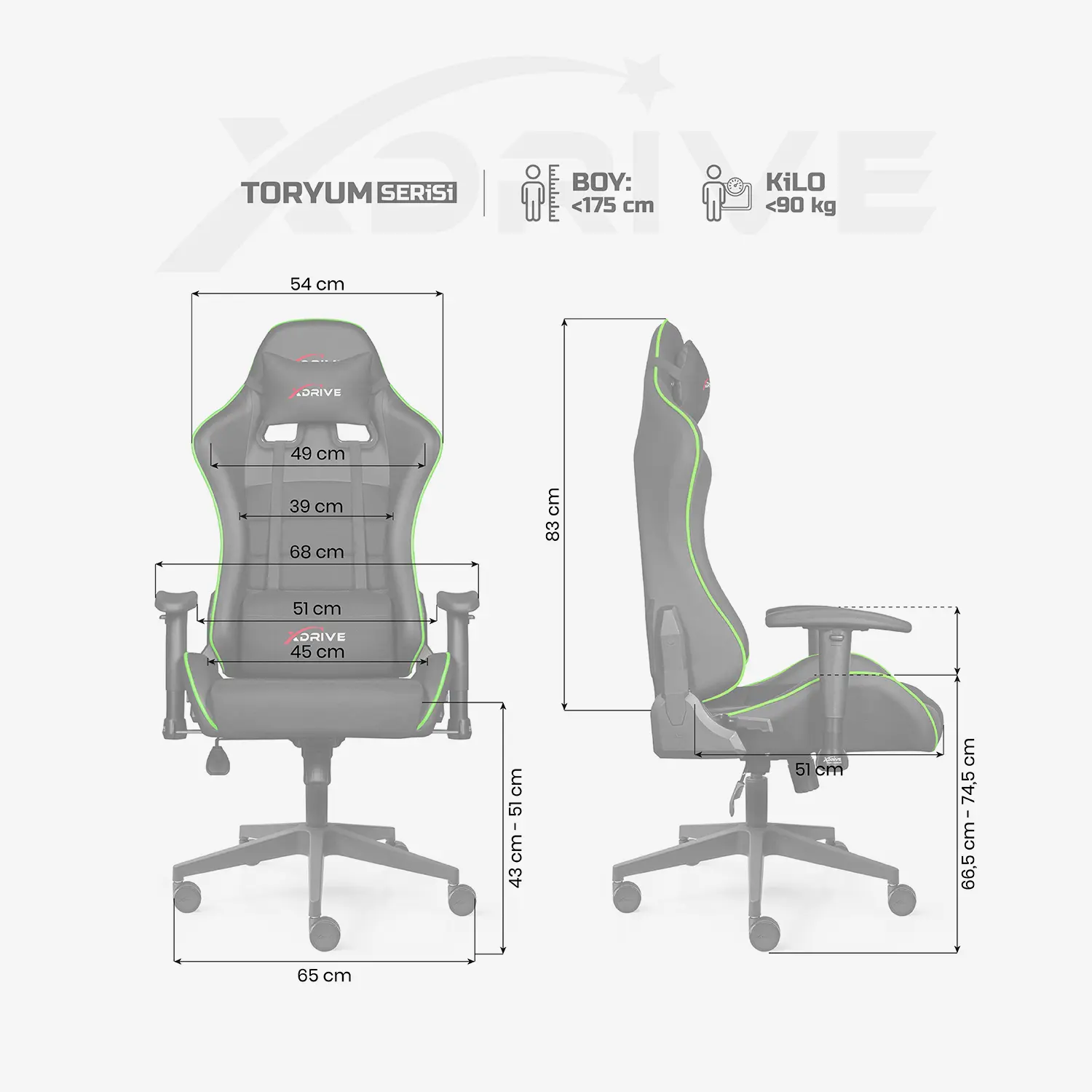XDrive, farklı vücut tiplerine uygun ergonomik tasarımlarıyla herkes için ideal oturma konforu sunar. Size en uygun modeli seçmek için ürün sayfasında bulunan Boy-Kilo Tablosunu inceleyebilir, vücut yapınıza en uygun koltuğu kolayca belirleyebilirsiniz. Maksimum konfor ve destek için doğru ölçüler ve kaliteli malzemeler büyük önem taşır. Oyuncu koltuğu modellerimizin detaylı ölçülerini ve kullanılan malzemeleri görmek için Ürün Ölçüsü kısmına tıklayarak inceleyebilirsiniz.